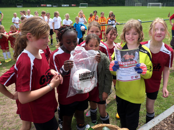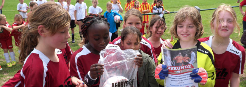 Die Arbeitsgruppen der Grundschulen von Misburg und Anderten im Bereich Fußballförderung überzeugten in diesem Jahr erneut mit tollen Leistungen.Nach der Stadtmeisterschaft der Mädchen der Misburger Pestalozzi-Grundschule ging es erneut auf der Anlage der DJK Marathon in den Herrenhäuser Gärten um den Bezirkstitel. Wettergott Petrus hatte diesmal ein Einsehen und lies die Sonne aus allen Knopflöchern scheinen.Bevor die Spielerinnen von Trainerin Renate Schmidt in die Sommerferien entschwinden konnten, ging es in 5 Spielen um den Bezirkstitel.Die Misburger Mädchen kamen mit ihrem Spielwitz gepaart mit technischer Feinheit bei allen Begegnungen nie in Schwierigkeiten. Im entscheidenden Spiel gab es einen 2:1 Sieg gegen die Schule aus Hildesheim-Himmelstür. Ungeschlagen und mit 17:3 Toren holte man den Bezirkstitel nach Misburg in die Pestalozzi-Grundschule.Auch in Anderten gab es Grund zum Jubel. Die feine Leistung der Jungen der Kurt-Schumacher Schule als Sieger bei der Stadtmeisterschaft bedeutete eine Reise zum Bezirksturnier nach Alfeld/Leine.Wenn eine Mannschaft den Hannovertitel geholt hat, braucht sie sich auf der Bezirksebene nicht verstecken. Genauso gingen die Spieler der Kurt-Schumacher-Schule die Spiele an. Lange hielt man den Einzug in das Finale offen.Bei der Endabrechnung reichte es zum „Kleinen Finale“. Den Sieg allerdings musste man der Schule aus Camp Asendorf überlassen. Danach ging es ab in die Sommerferien.Spielleiter Klaus-Dieter Ruddat vom Kreis Hannover zeigte sich hoch zufrieden mit dem Leistungsstand und dem Abschneiden der Grundschulen aus Misburg-Anderten.27.06.2016 Bericht: KunoBilder: Renate Schmidt